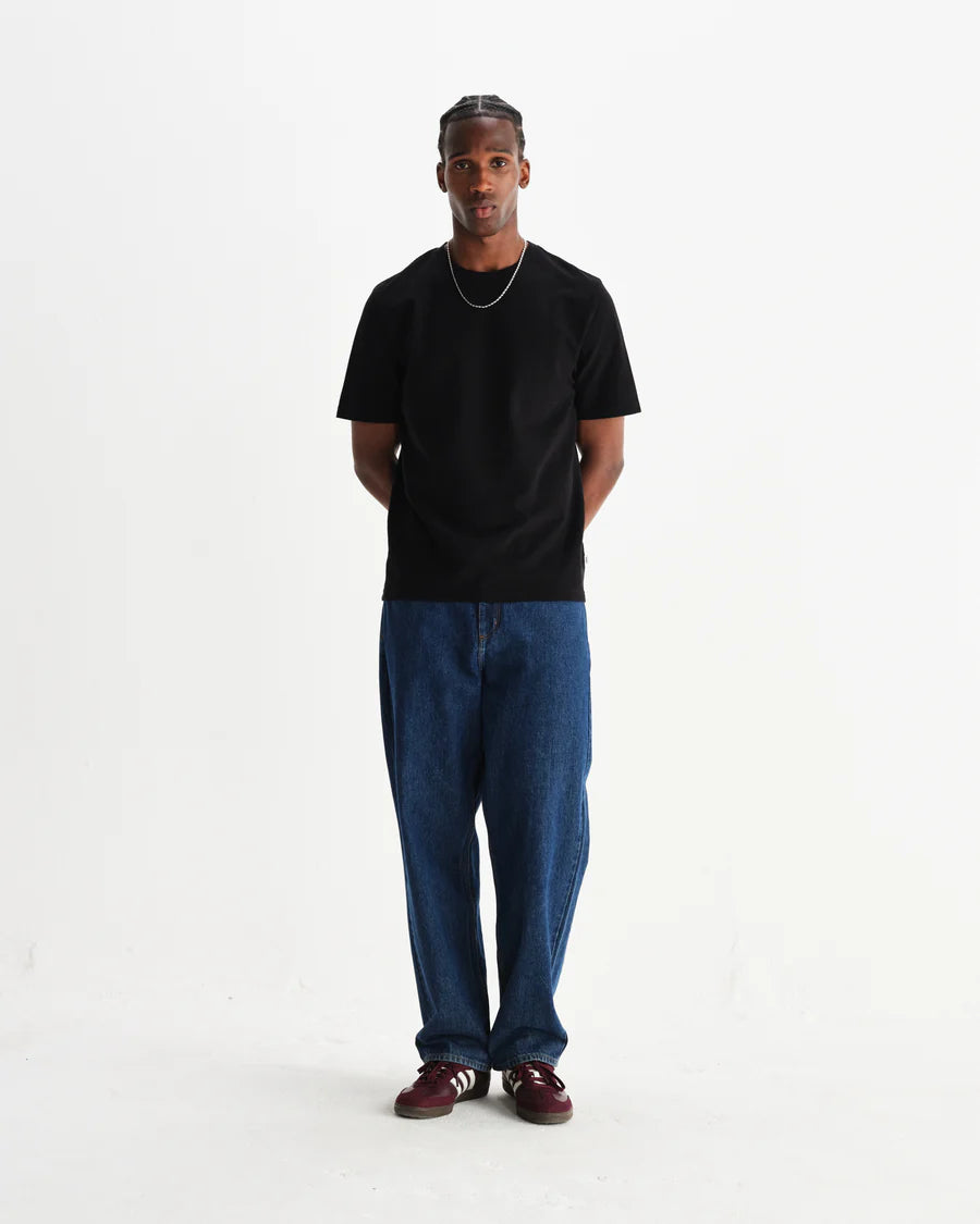 The Dean represents our quintessential regular-fit tee, crafted from exclusive textured 280g organic jersey that delivers substantial weight and luxurious softness. This season's essential black colourway combines understated elegance with everyday versatility, making it a refined foundation piece for any wardrobe. Premium construction meets conscious design in this timeless staple.